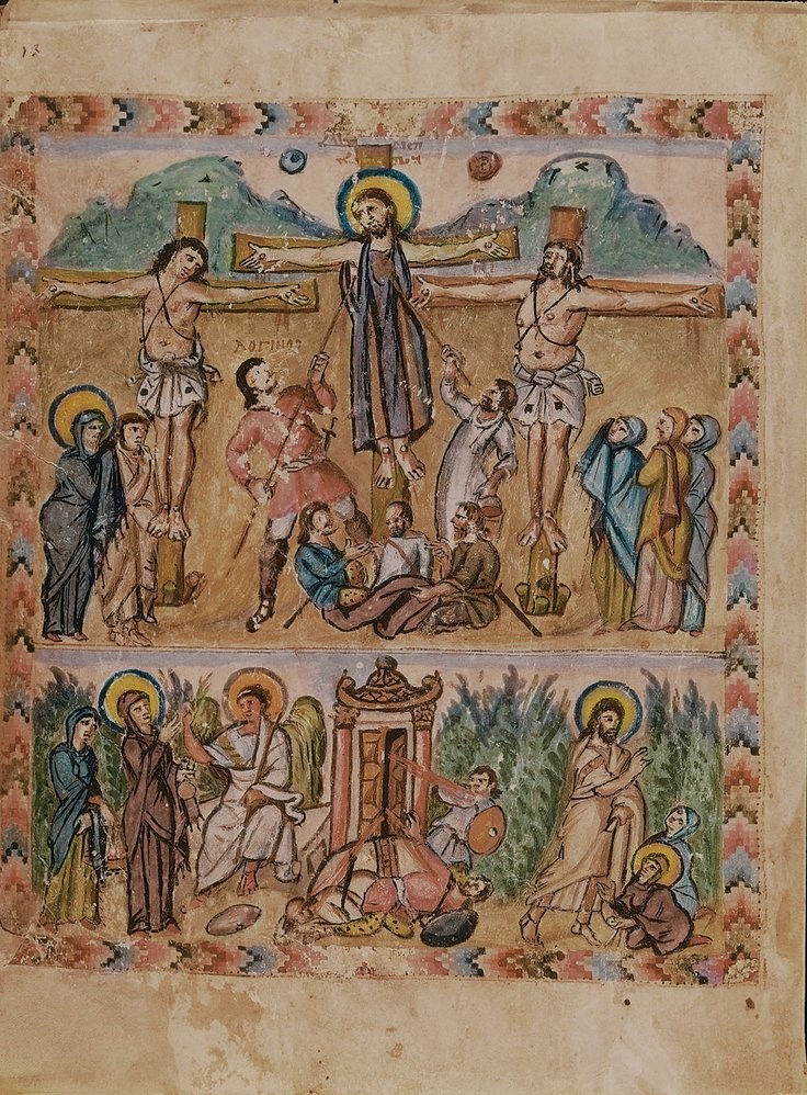 [The image displayed on the preview of this post in the main page of the blog is from a 6th-century Syriac illuminated manuscript from the Rabbula Gospels. It is currently found in the Laurentian Library in Florence, Italy. It has both a Syriac inscription (above Christ’s head) and Greek (above the soldier stabbing Jesus with the spear). You can read more about it here.]