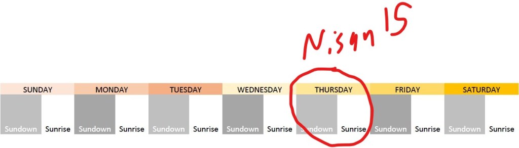 Nisan-15, according to the chart above, would have to fall upon Jewish Thursday. So then, the High Sabbath of the Feast of Unleavened Bread, according to the reckoning of the Jewish week (which itself is derived from Genesis 1), would be on this day: