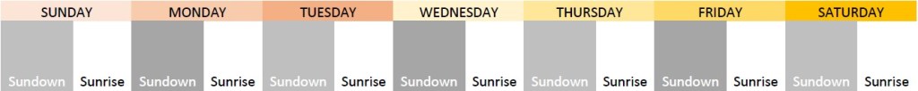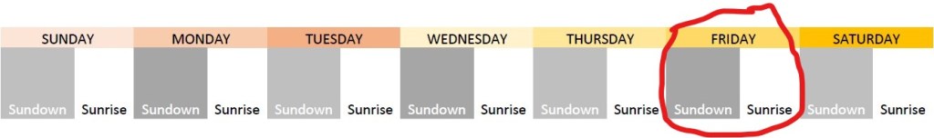 The grey portions represent “nighttime.” Sunrise, or the time designating the daytime is clearly marked. As you can see, in line with common parlance, midnight marks the shifting of one day to another. Without a timepiece (a watch) or some basic knowledge of astronomical occurrences (and basic night visibility to match such knowledge), the measuring of days in the modern Western schema can prove to be quite difficult.